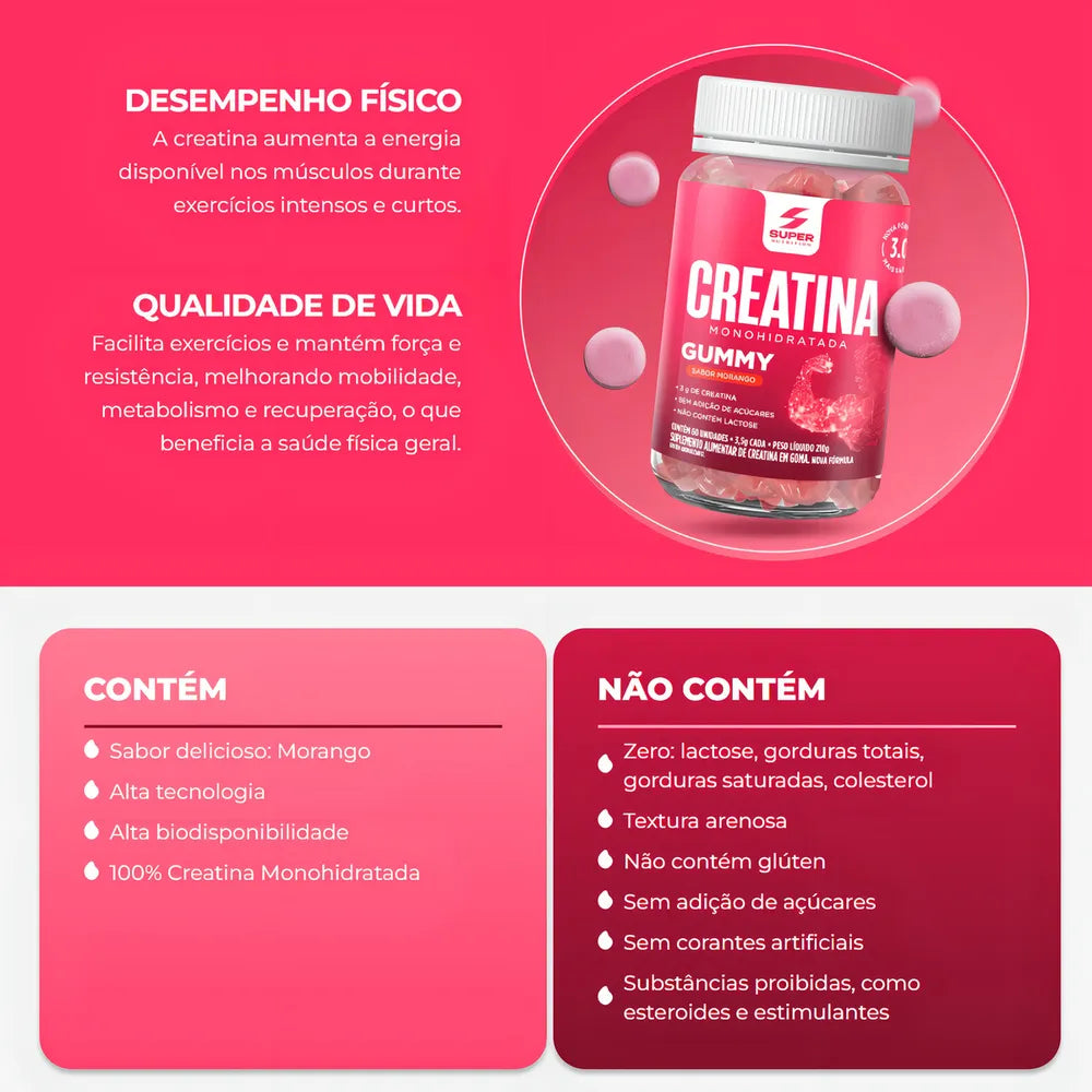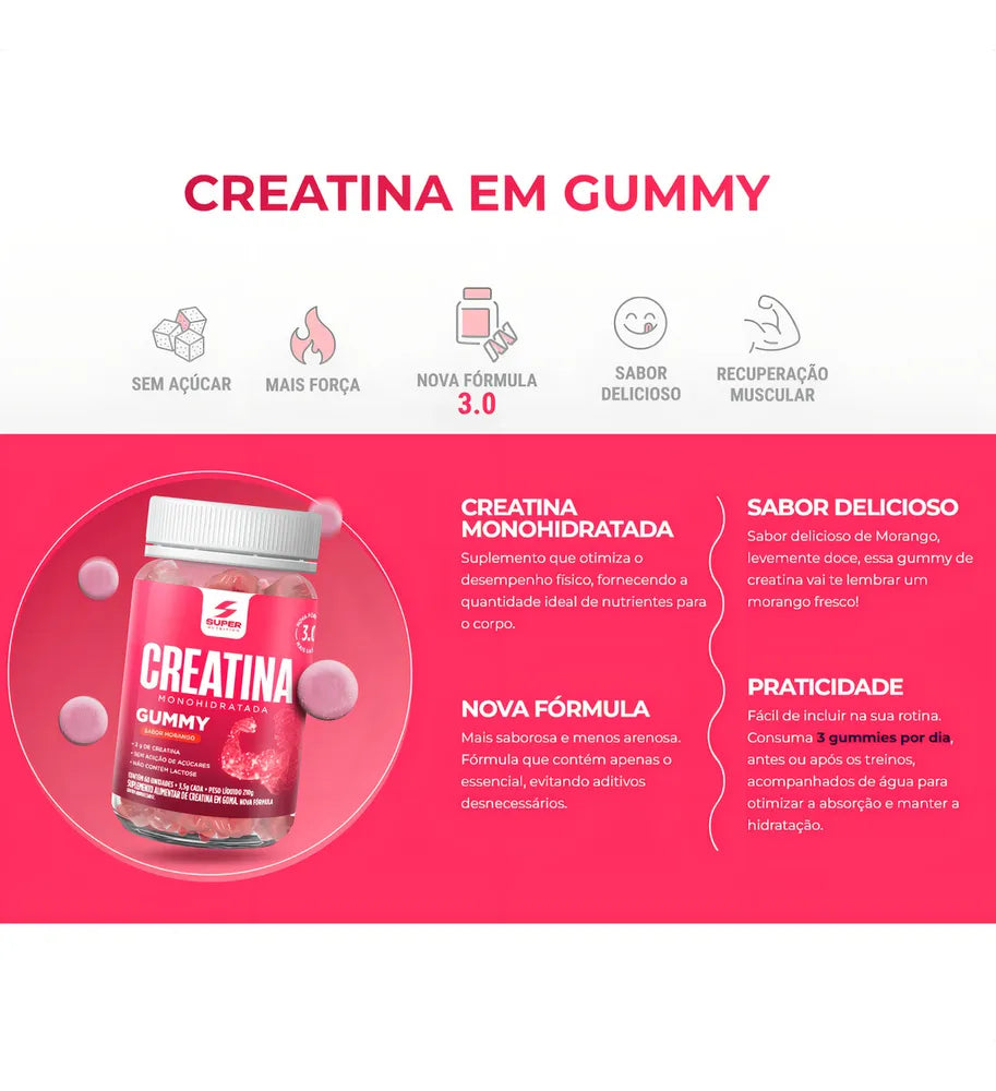 Sabor delicioso de Morango, levemente doce, essa gummy de creatina vai te lembrar um morango fresco!