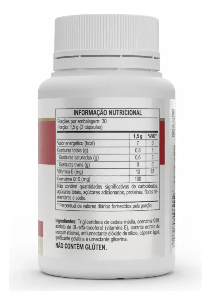 Triglicerídeos de cadeia média, coenzima Q10, DL-alfa-tocoferol (vitamina E), corante natural de urucum e antiumectante dióxido de silício. Composição da cápsula: gelatina, água purificada e umectante glicerina.