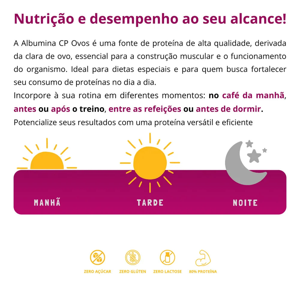 Garanta mais força, energia e recuperação muscular com a Albumina CP Ovos. Suplemento proteico de alto valor biológico, feito a partir da clara de ovo desidratada, pura e sem aditivos artificiais.