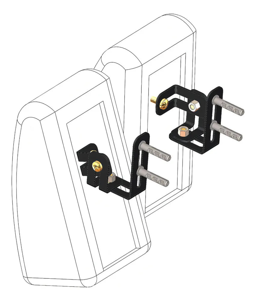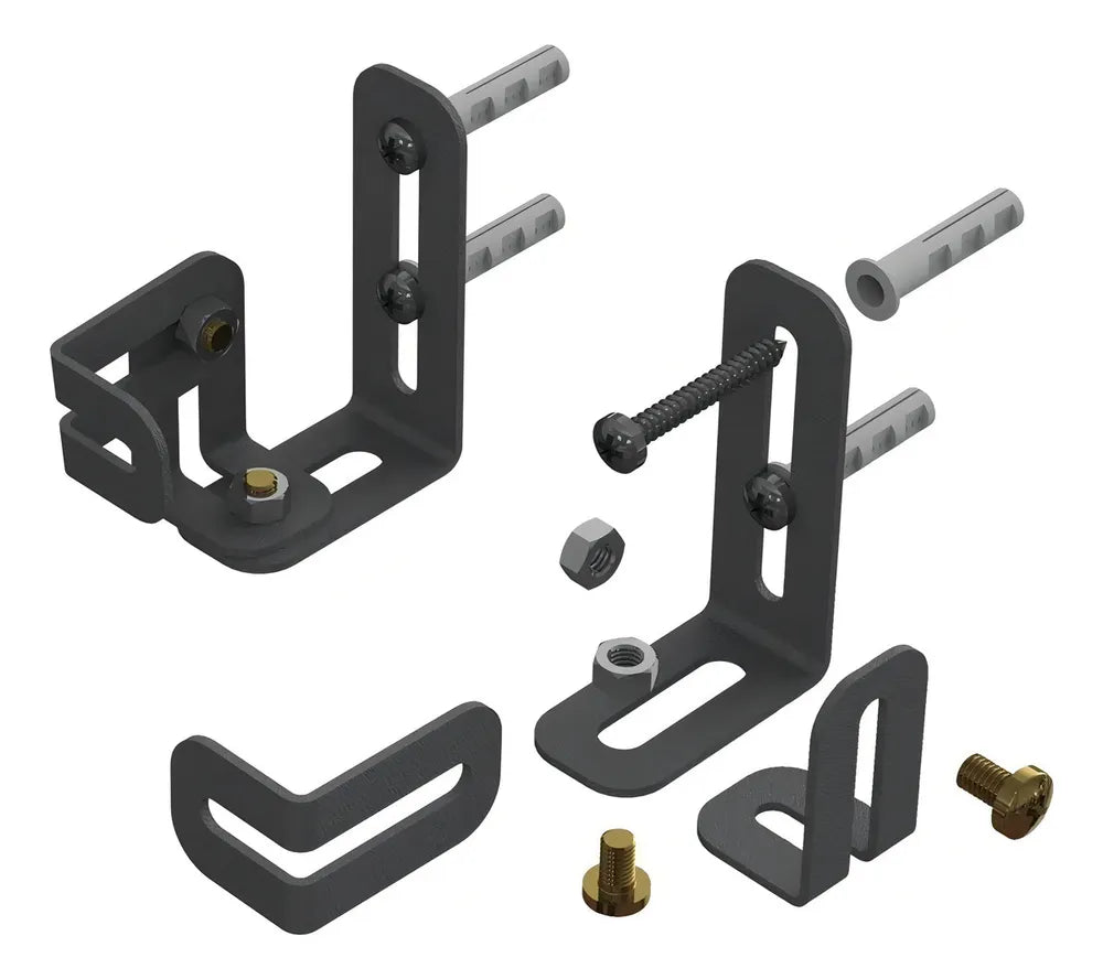 Suporte para caixas de som, Home Theater ou caixas acústicas. Permite várias formas de fixação das caixas.