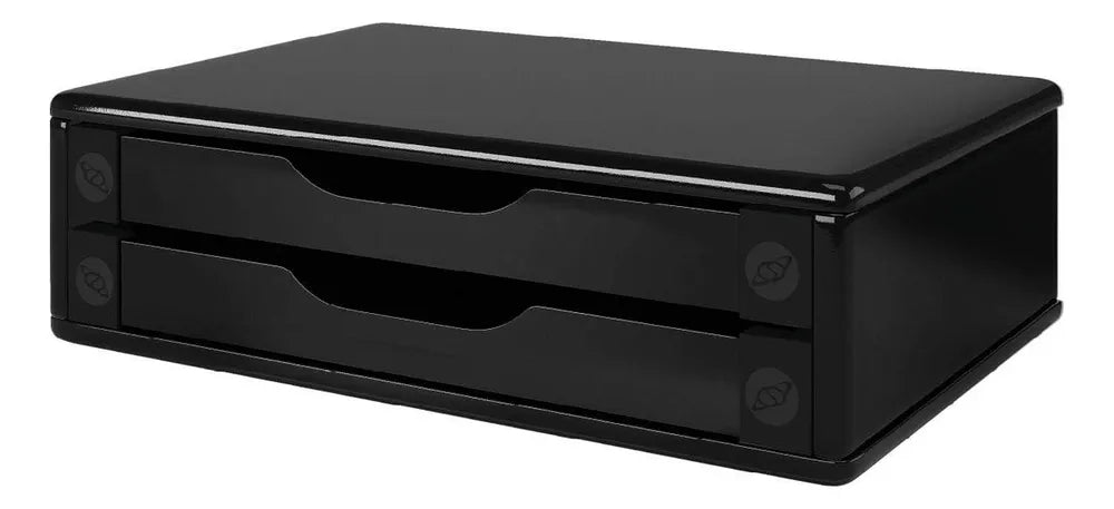 Esse gaveteiro é muito funcional, levanta o monitor na altura dos olhos e ainda ajuda a manter a mesa organizada.
