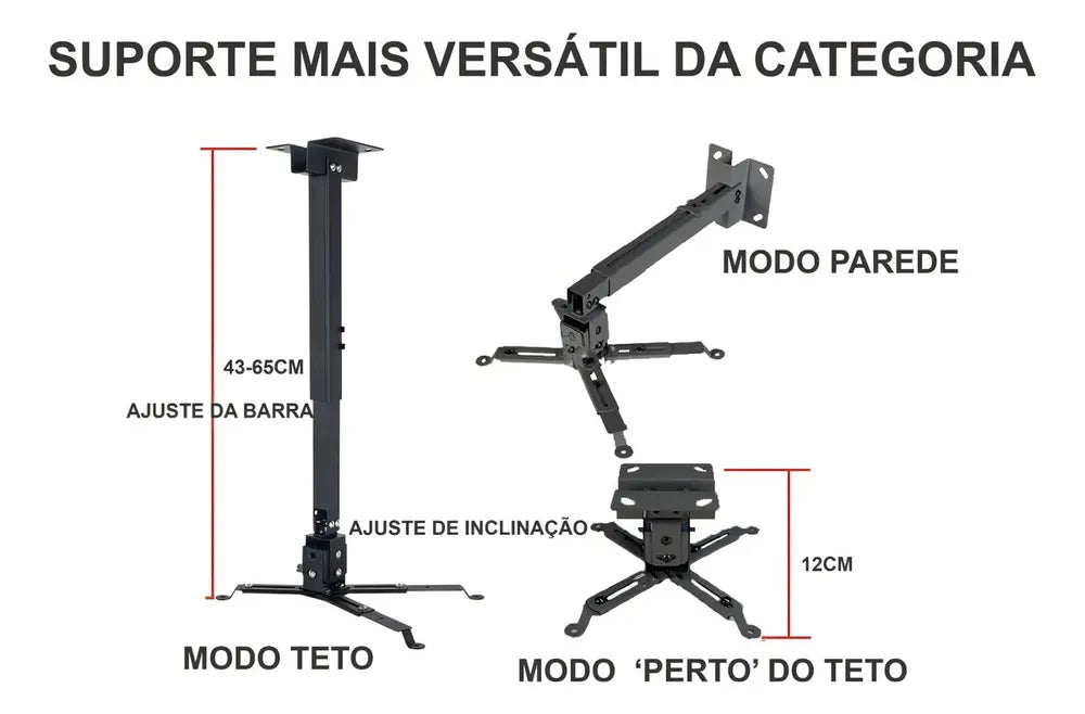 Suporte Projetor Parede: base flexível e haste telescópica com regulagem de 43 a 63cm.