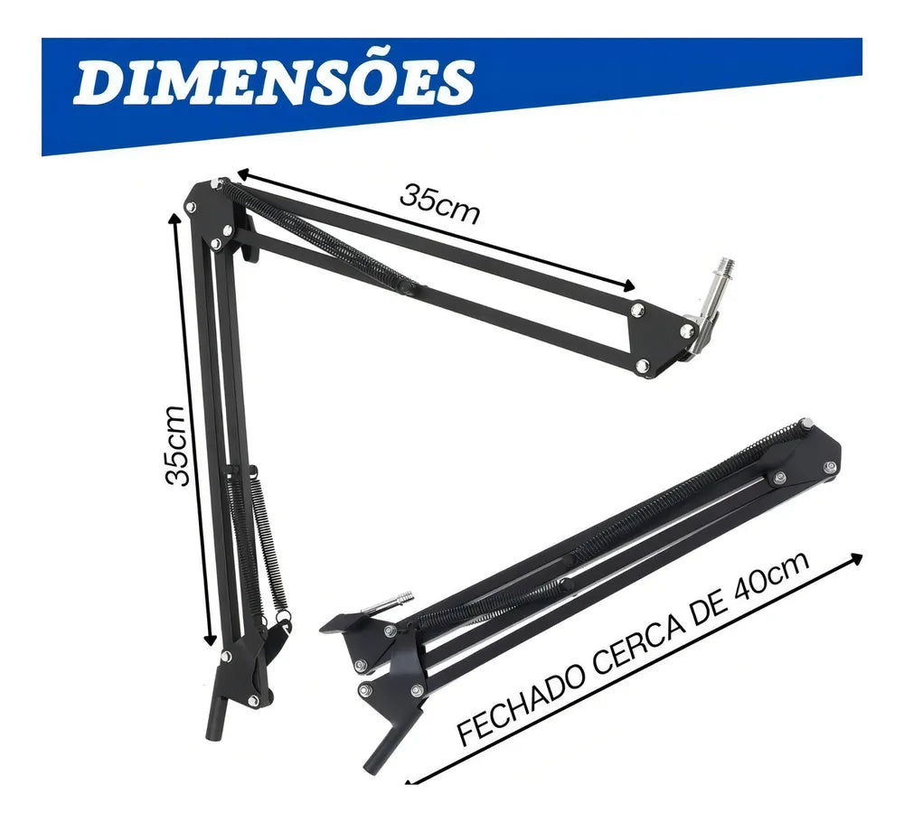 Feito em metal resistente, este suporte possui altura máxima de 80 cm e altura mínima de 40 cm, permitindo ajustes precisos de acordo com a necessidade do usuário. Seu braço articulado facilita o posiciomento do microfone, proporciondo maior liberdade de movimento e permitindo ajustes precisos de angulação.