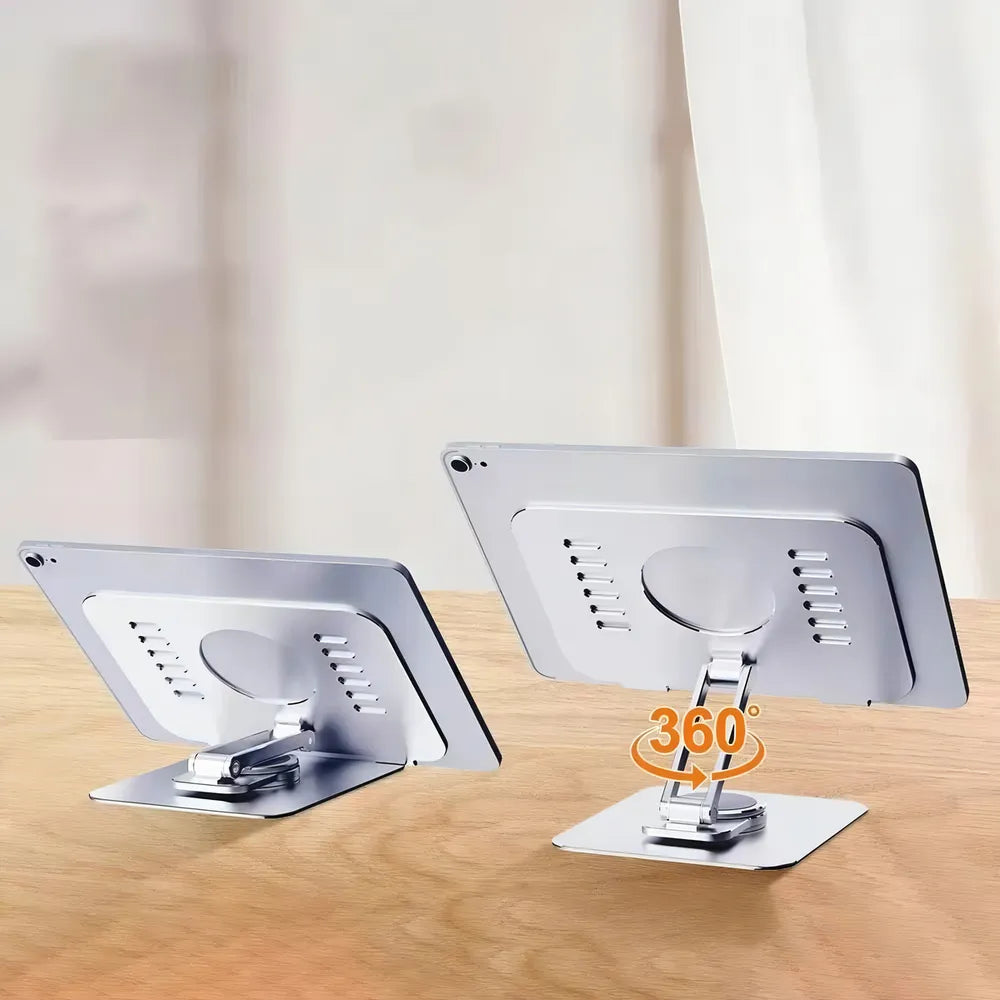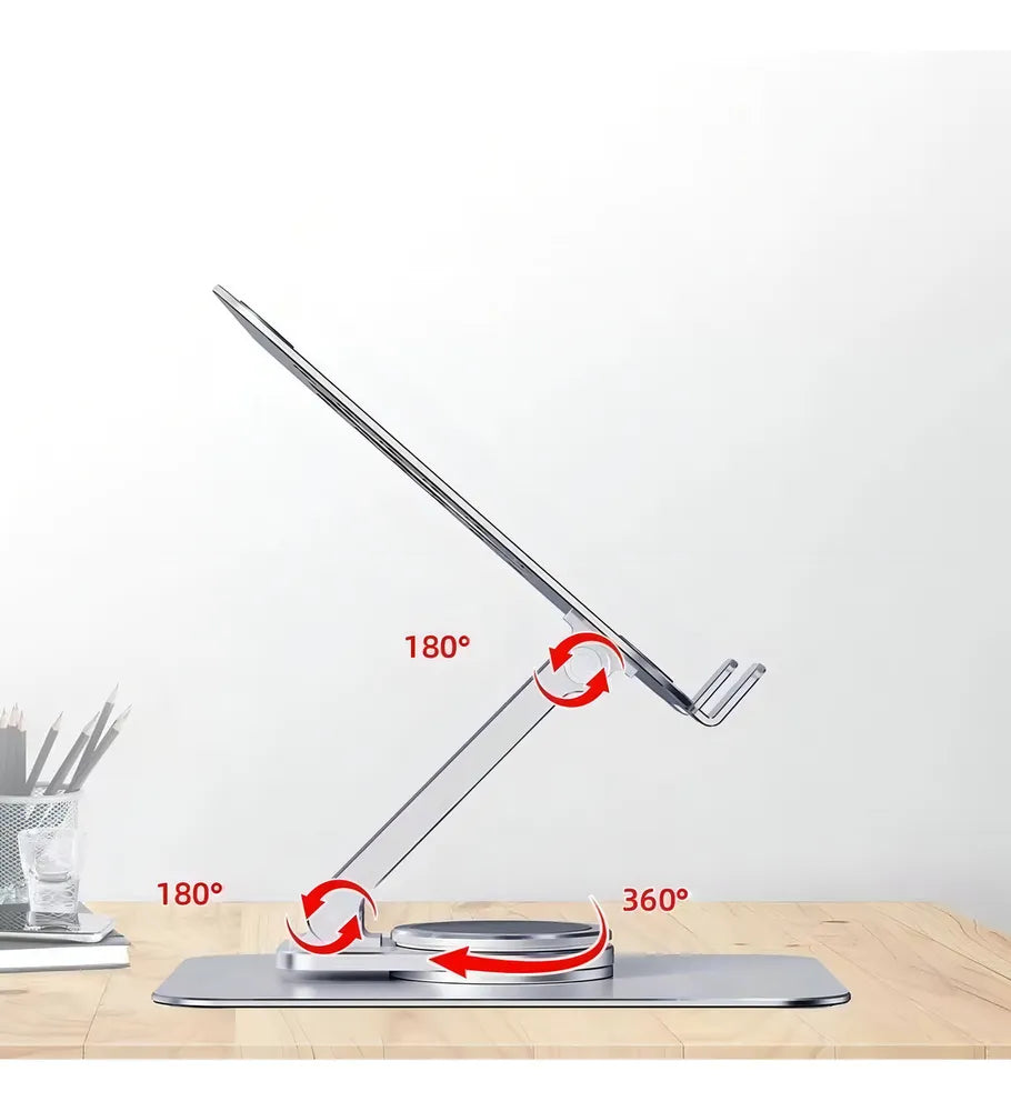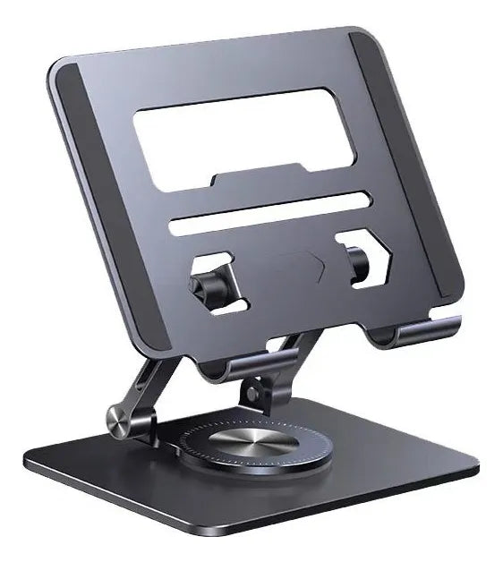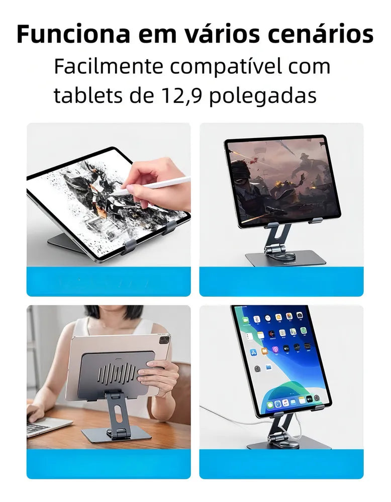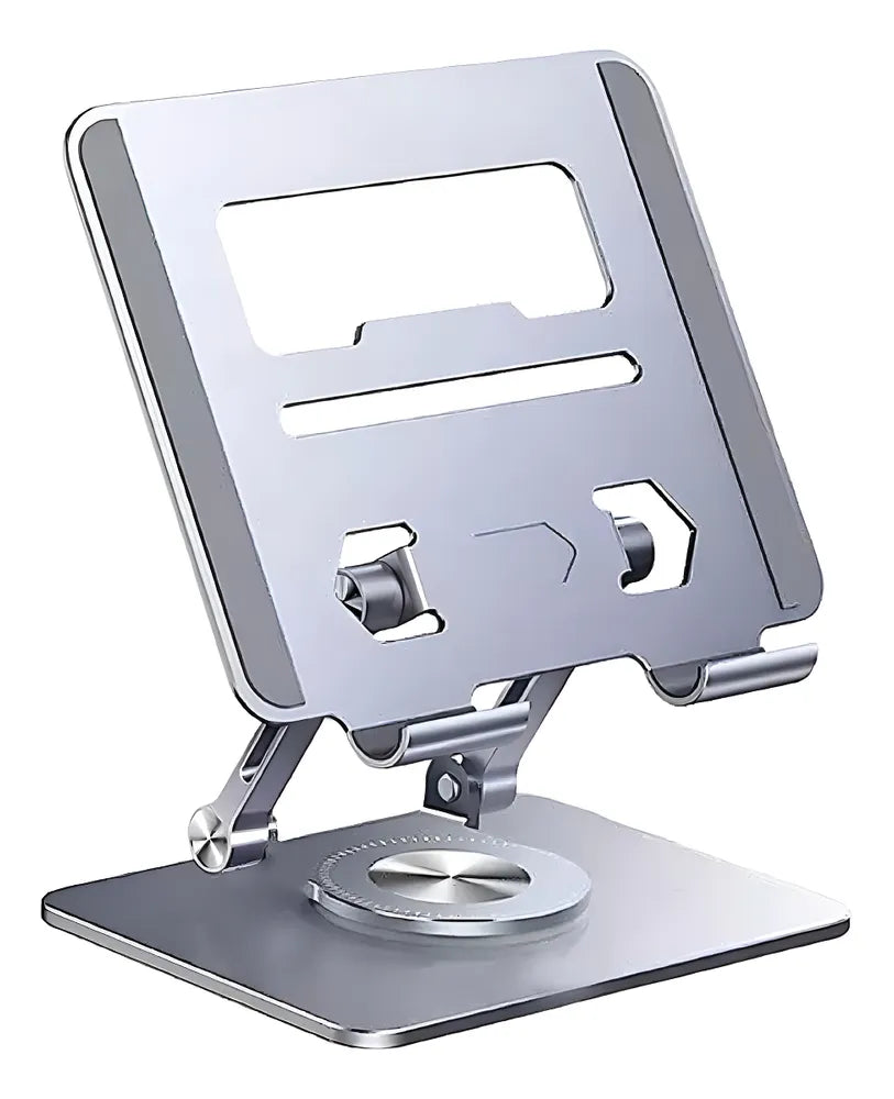 Suporte Giratório 360° De Alumínio P/ Tablet Ate 12 Polegada' é um suporte dobrável e rotativo para tablets. Possui um chassi de rotação de 360°, proporcionando flexibilidade para girar o tablet em qualquer ângulo.