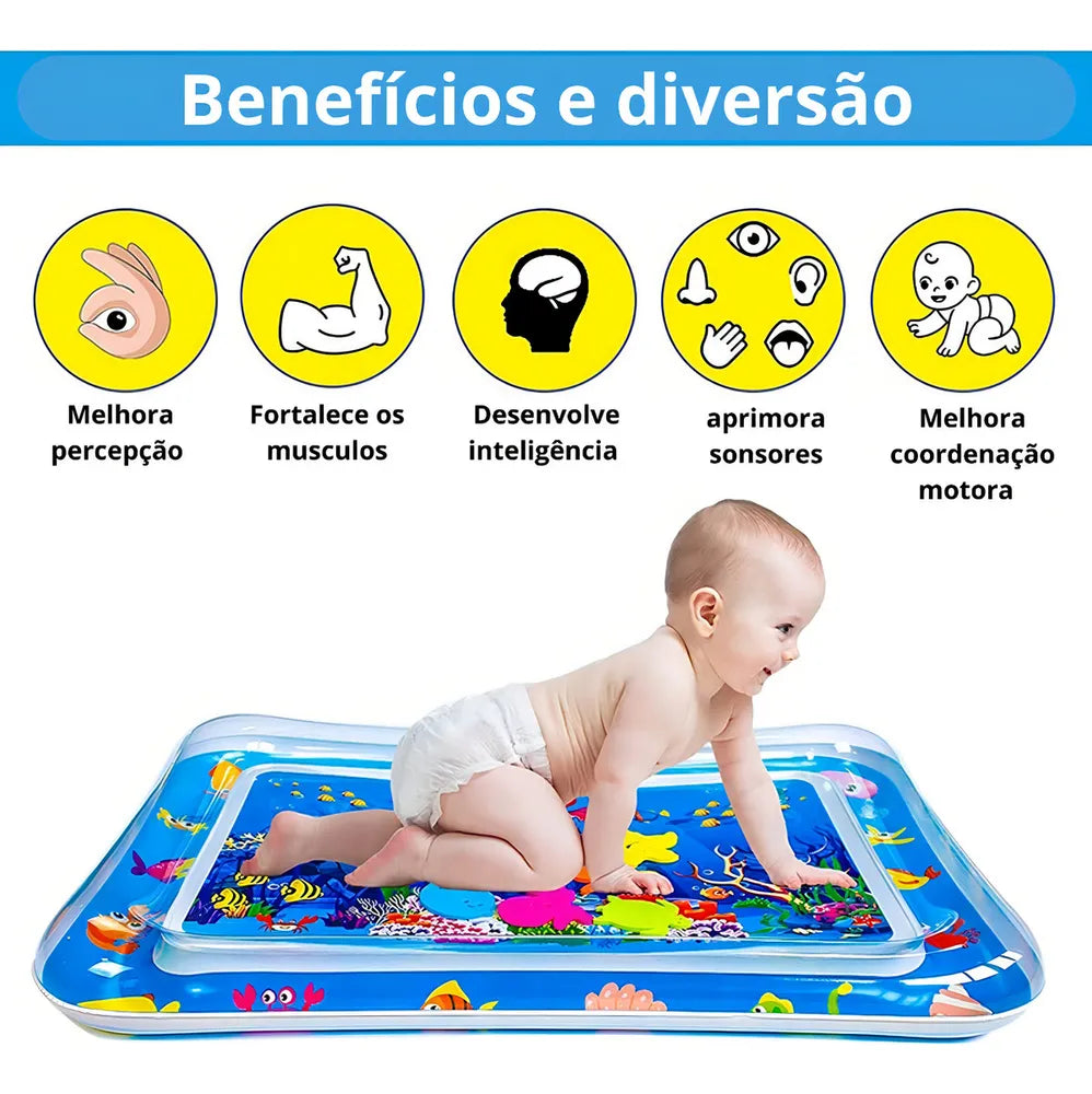 O Tapete de Água Inflável Baby Fundo do Mar foi desenvolvido especialmente para entreter e contribuir com o desenvolvimento motor dos pequenos. Ao ser utilizado enquanto o bebê permanece de bruços, o tapete ajuda a fortalecer os músculos do pescoço, costas e ombros — um passo essencial para que ele aprenda a sentar, engatinhar e dar os primeiros passos.