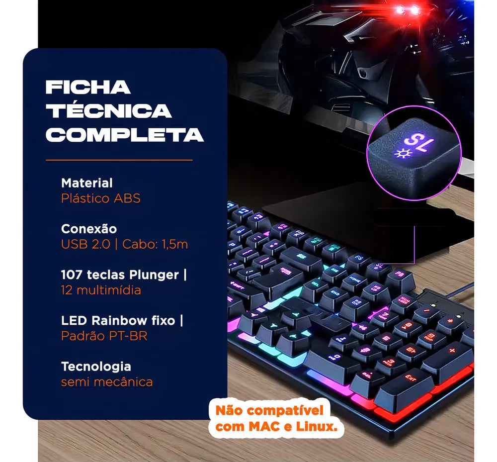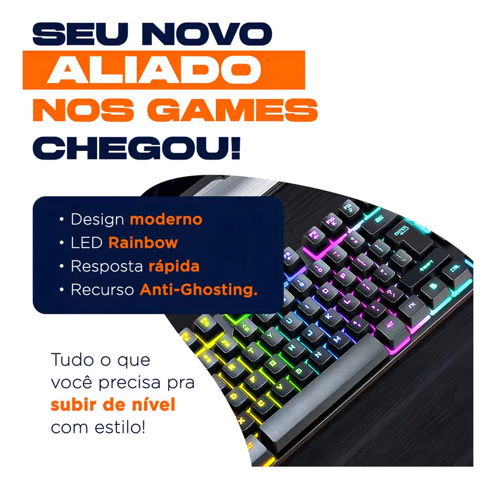 O teclado gamer Battle com LED RGB, modelo BK-151C, é uma excelente escolha para quem busca desempenho e estilo. Ele possui um design moderno e resistente, perfeito para sessões de jogo intensas. As luzes LED RGB oferecem uma iluminação vibrante e personalizável, permitindo que você ajuste as cores de acordo com seu gosto ou o ambiente. Além disso, o teclado é confortável para usar por longas horas, com teclas sensíveis e duráveis. É uma ótima opção para gamers que querem combinar funcionalidade e estética!