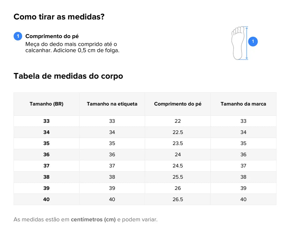 Comprimento do pé Em um papel, desenhe o contorno dos pés descalços. Meça do dedão até o calcanhar. Adicione 0,5 cm de folga.