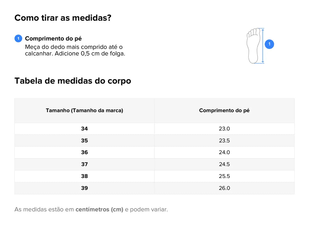 Comprimento do pé Em um papel, desenhe o contorno dos pés descalços. Meça do dedão até o calcanhar. Adicione 0,5 cm de folga.