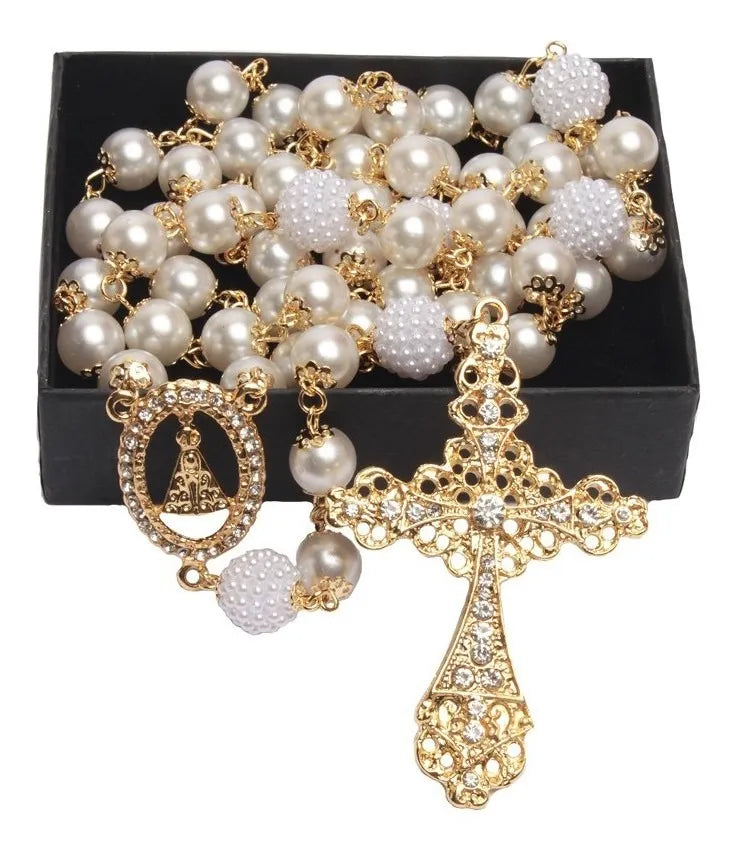 Cada pérola é apoiada por tulipas com banhada A Ouro. Cruz com Banhado A Ouro cravejada com strass.