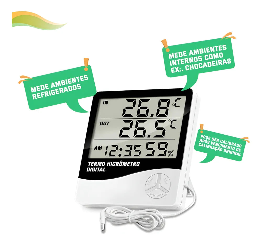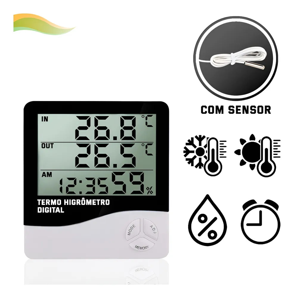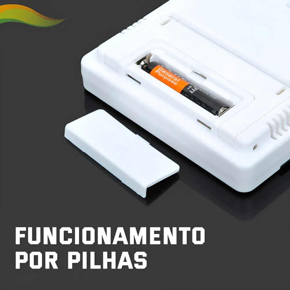 Este termo higrômetro digital é alimentado por pilhas AAA, o que o torna portátil e fácil de usar em qualquer lugar. Além disso, possui um relógio integrado, tornando-o um dispositivo multifuncional que não só monitora as condições do ambiente, mas também ajuda a manter a hora.