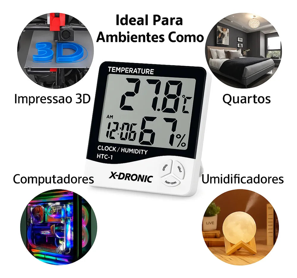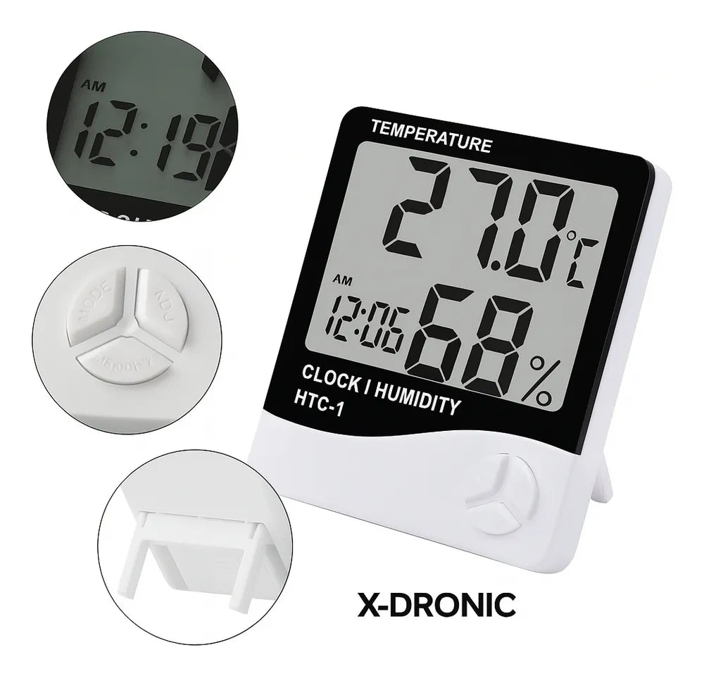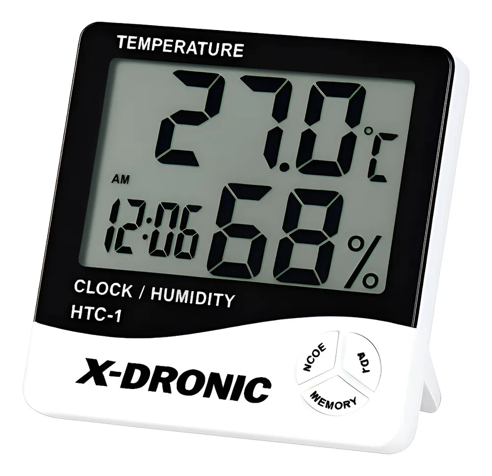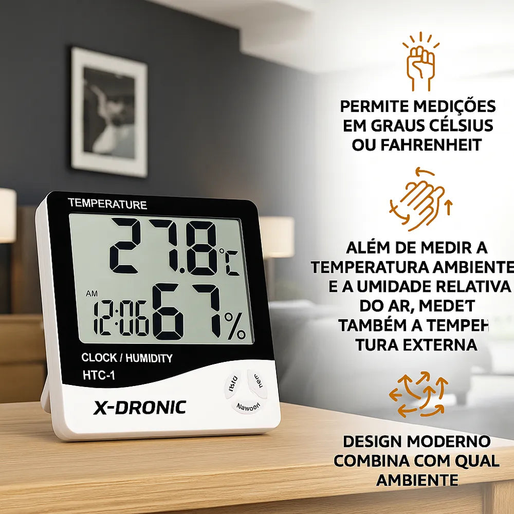 O Termo-Higrômetro X-DRONIC é ideal para monitorar a temperatura e umidade em ambientes internos e externos, com alta precisão, display de fácil leitura e funções adicionais como relógio, despertador e memória de máximas e mínimas.