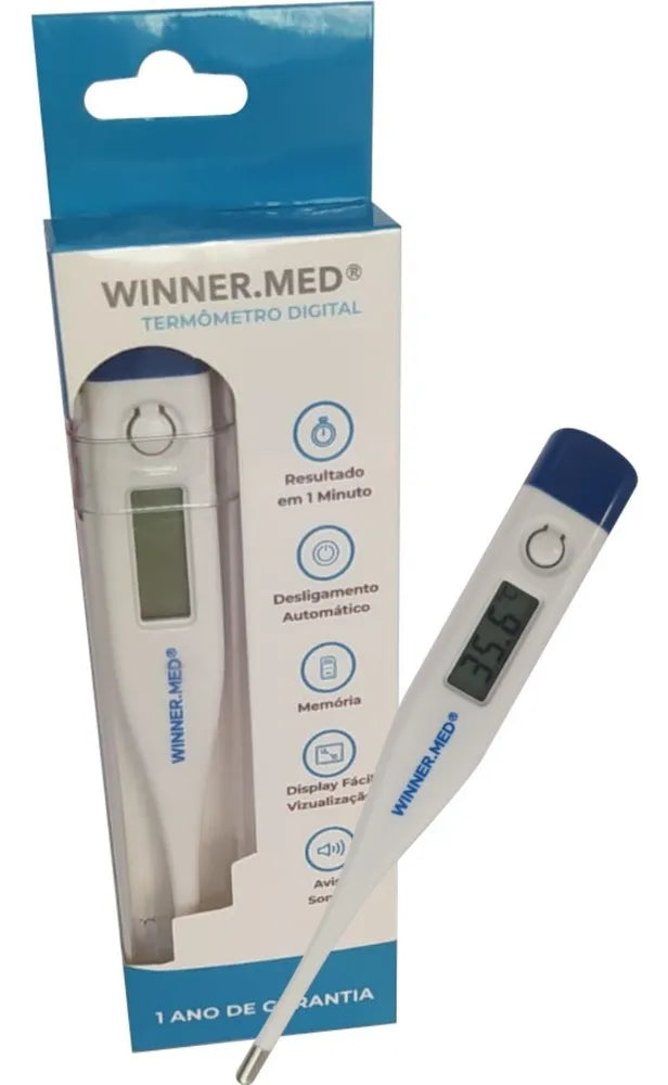 O Termômetro Clínico Digital é um produto de fácil utilização e com resultados confiáveis. Possui indicador sonoro e sua tomada de temperatura é cerca de 1 minuto.