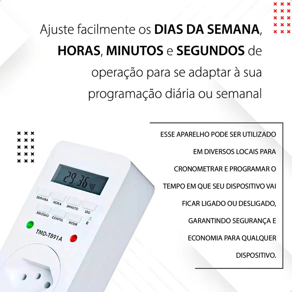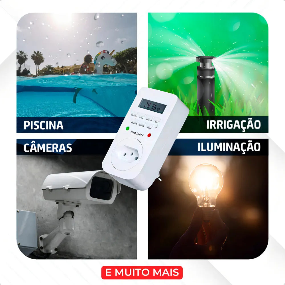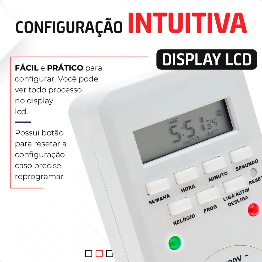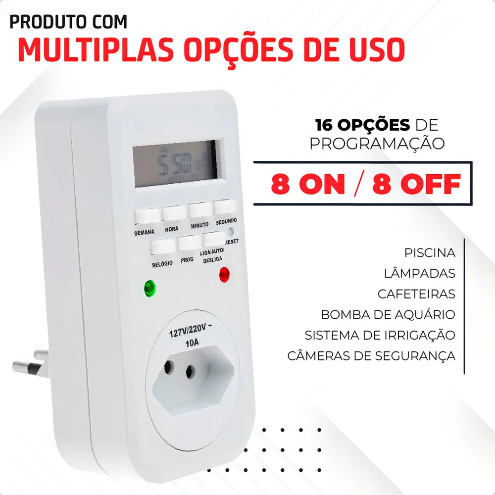 Transforme sua casa ou negócio com praticidade e tecnologia! O Temporizador Digital Programável LCD oferece até 18 programações diárias ou semanais, ajudando você a automatizar aparelhos, economizar energia e aumentar a segurança.