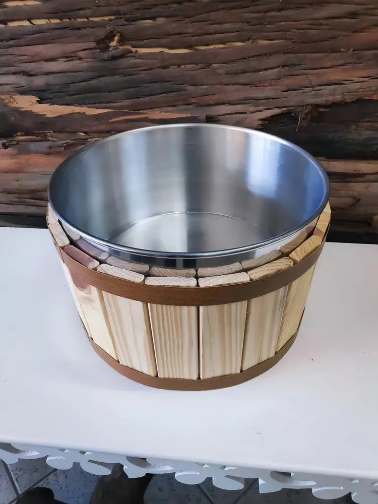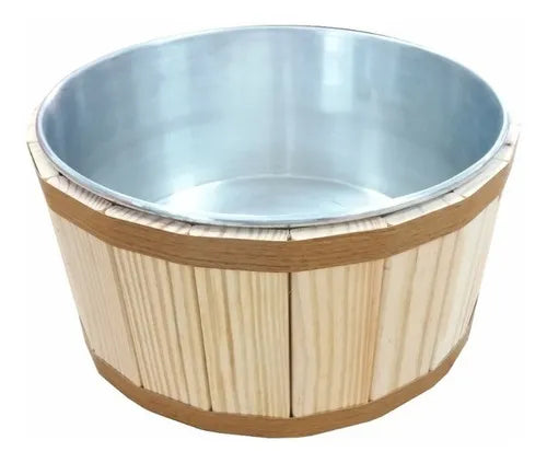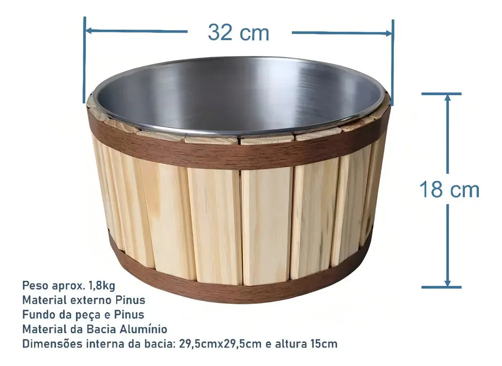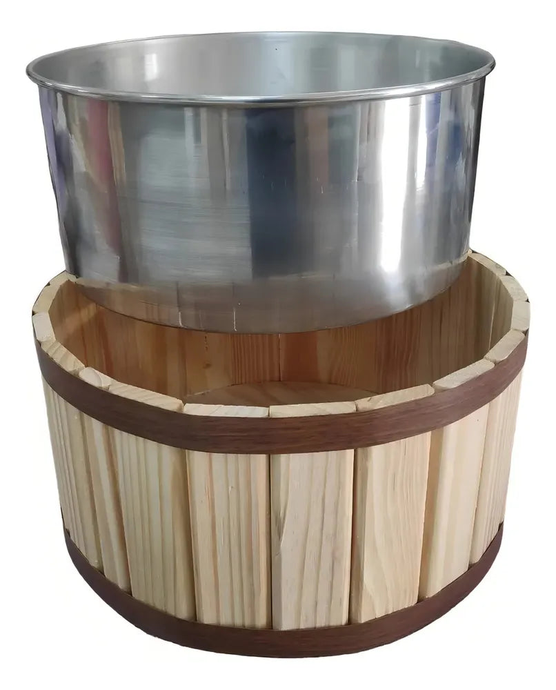 O balde de alumínio sai com facilidade da estrutura de madeira para higienização.