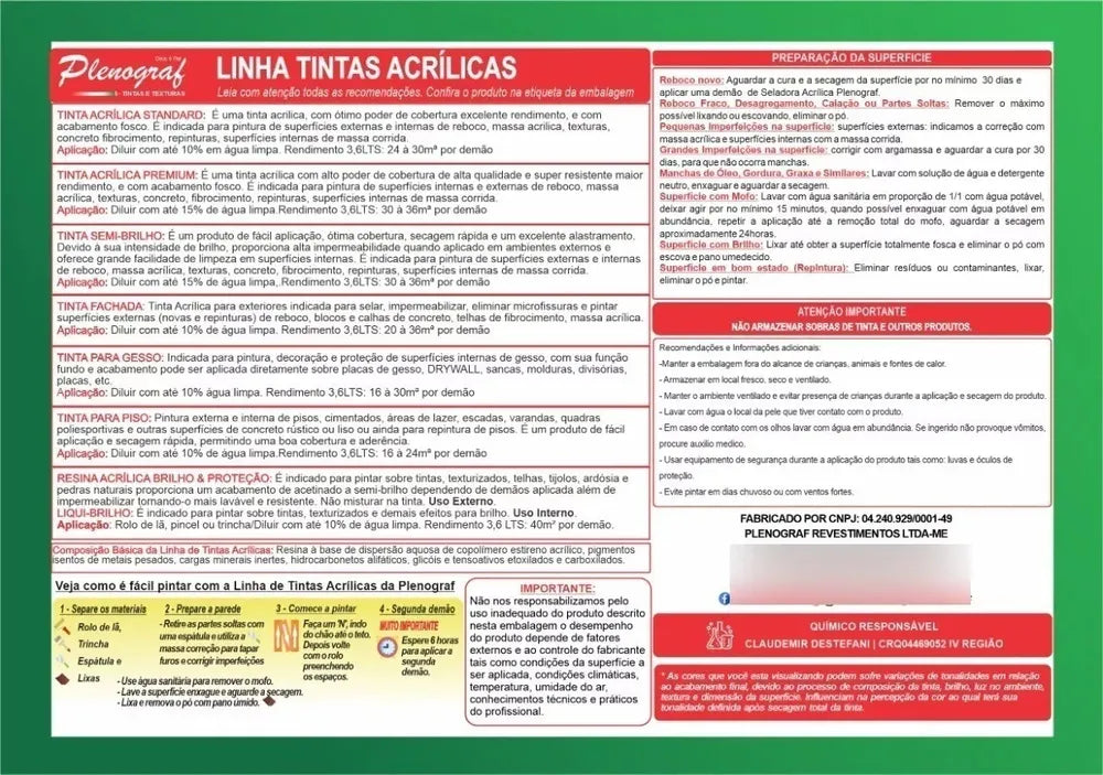 Rendimento por demão: de 10 a 15 m² por galão de 1 litros, podendo variar conforme o estado da superfície e a técnica do aplicador.