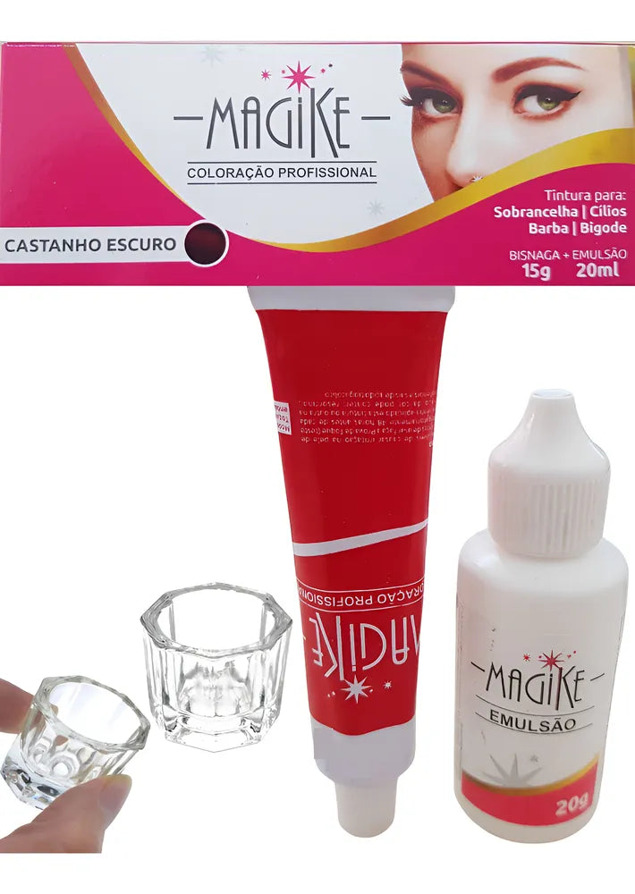 Castanho escuro - MAGIKE COLORAÇÃO PROFISSIONAL uma tintura específica para sobrancelhas, cílios, barba e bigode. Permitem criar um volume das raízes às pontas e suas sobrancelhas e cílios ficam mais destacadas e o melhor, de forma natural. É ideal para mulheres e homens que já estão com seus pelinhos brancos, ou para quem está com os pelinhos claros demais. A tinta é completamente profissional e impermeável (à prova d'água). Nutre e trata enquanto colore, realça fios claros e brancos.