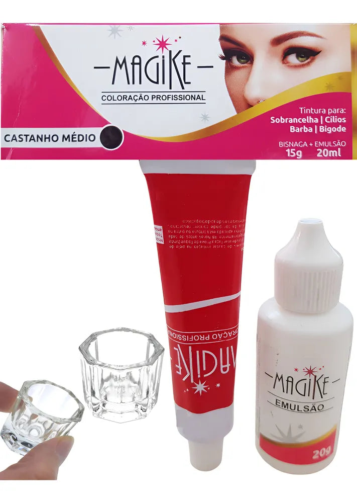 Castanho Médio - MAGIKE COLORAÇÃO PROFISSIONAL uma tintura específica para sobrancelhas, cílios, barba e bigode. Permitem criar um volume das raízes às pontas e suas sobrancelhas e cílios ficam mais destacadas e o melhor, de forma natural. É ideal para mulheres e homens que já estão com seus pelinhos brancos, ou para quem está com os pelinhos claros demais. A tinta é completamente profissional e impermeável (à prova d'água). Nutre e trata enquanto colore, realça fios claros e brancos.