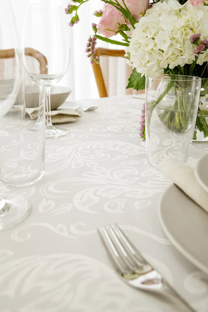A toalha de mesa em Jacquard impermeável da GMRM Decor une a mais alta tecnologia em tecidos com o charme e elegância das tendências em decoração.