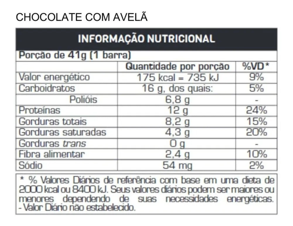 Chocolate com Avelã : Cobertura sabor chocolate ao leite, proteina concentrada do soro do leite, recheio de ganache chocolate meio amargo, caseína, caseinato de cálcio, colágeno hidrolisado, óleo de girassol, cacau alcalino em pó, edulcorantes xarope de maltitol e sucralose, umectante glicerina, emulsificante lecitina de girassol, aromatizante e antioxidante DL-alfa-tocoferol.
