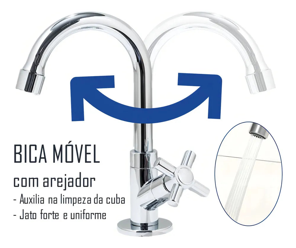 - A bica móvel facilita o uso e a limpeza da cuba, pois alcança onde você precisa. O bico com arejador oferece um jato contínuo, forte e preciso.
