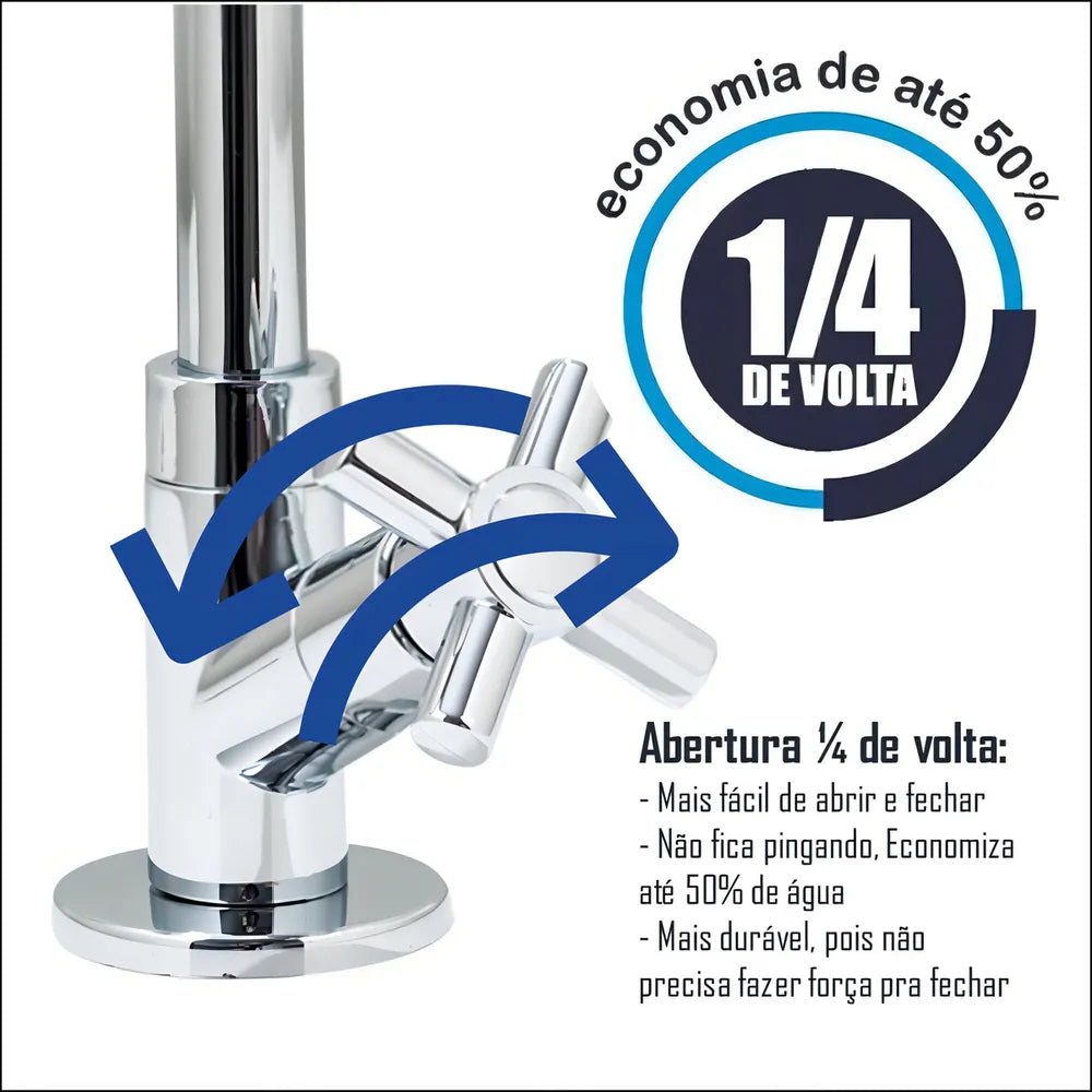 - O mecanismo de abertura 1/4 de volta traz conforto ao abrir e fechar a torneira. Não é preciso girar muito para abrir, nem ficar apertando ao fechar e a água não fica pingando. Isso, além de trazer economia de água, faz com que o mecanismo dure muito mais que torneiras de abertura comum.