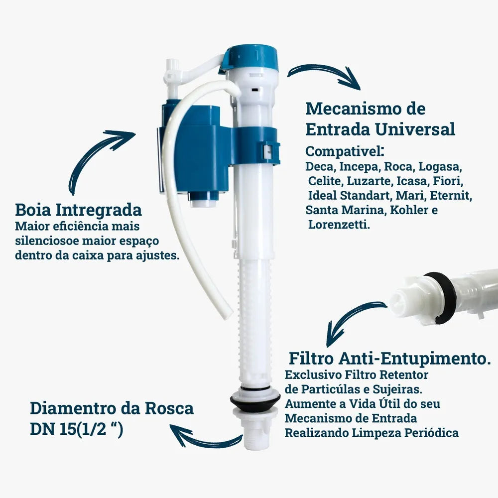 BOIA INCLUSA – Mecanismo Universal moderno com boia já integrada, deixando o conjunto mais resistente e facilitando a instalação. (MESMA EFICIÊNCIA DE UMA BOIA COMUM)
