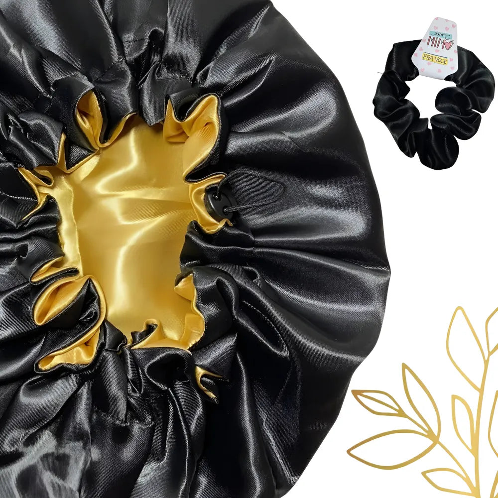 - Proteção dos cabelos: A touca de cetim e o scrunchie ajudam a proteger os fios contra o atrito e a quebra, reduzindo danos causados pelo contato direto com tecidos ásperos e elásticos apertados.