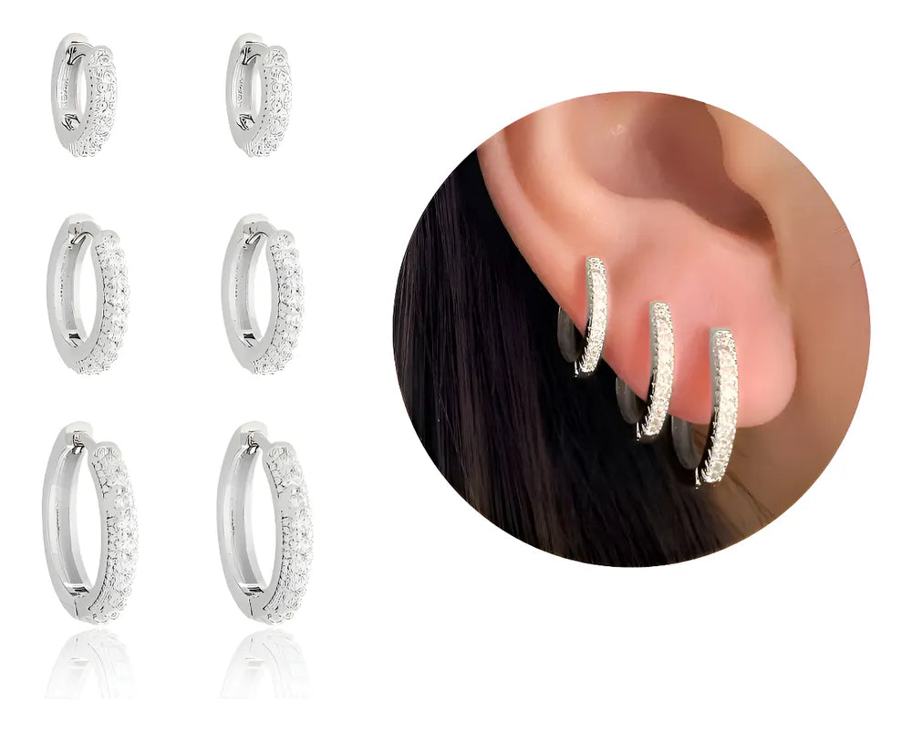 Trio de Brincos Argolas Finas Cravejadas Banho Prata 925