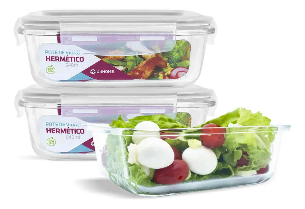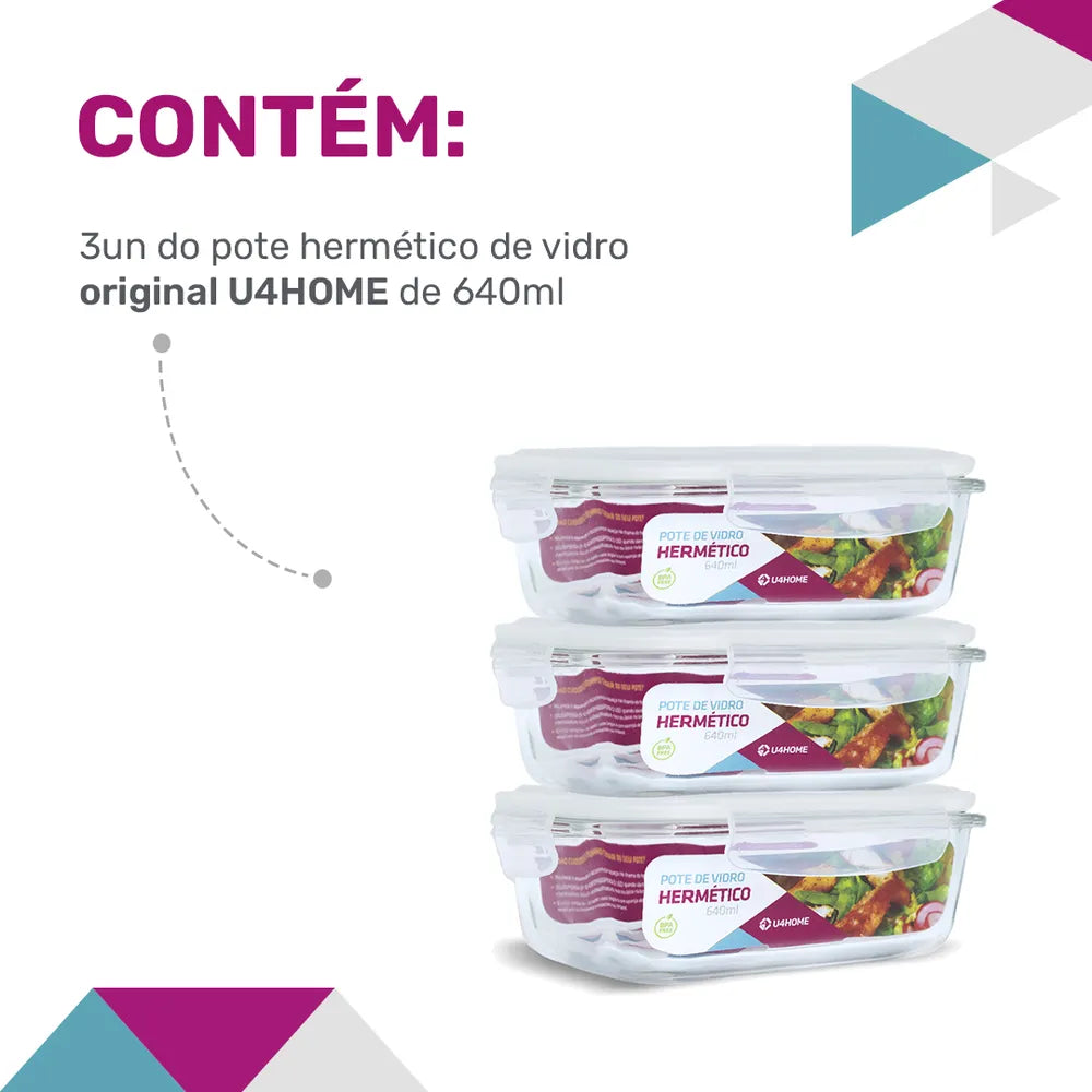 KIT 3 Potes de Vidro Quadrado com Tampa Hermética 640ml - U4home