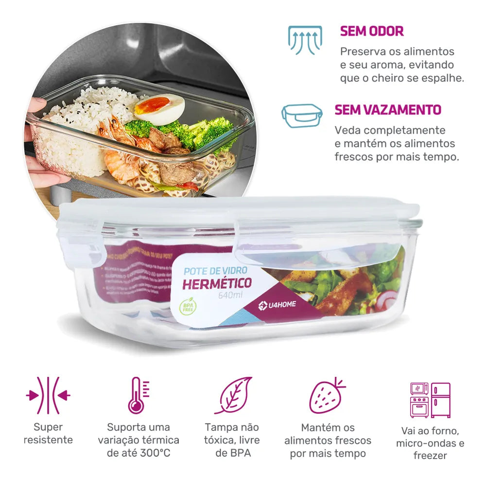 O Pote Quadrado com Tampa Hermética U4Home é perfeito para o cotidiano e assegura o armazenamento adequado de diversos alimentos. Confeccionado em vidro super resistente, pode ser utilizado no forno, microondas (sem a tampa) e freezer. Além de manter os alimentos frescos por mais tempo, evita que o odor se espalhe e sem risco de vazamentos. Possui 4 travas de fácil limpeza e higienização.