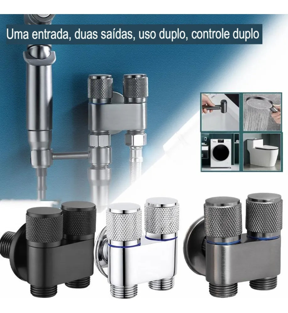 Fosco Prateado - 1/4 de volta com Design 1 em 2 saídas: esse design permite que os usuários conectem dois dispositivos ao mesmo tempo, como máquinas de lavar, pias e lavabos, aumentando a eficiência. Os usuários podem controlar de forma independente de acordo com suas necessidades, oferecendo grande flexibilidade.