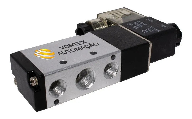 Válvula Pneumática Solenoide 5/2 Vias Retorno Mola Rosca 1/4 - Escapes 1/8 Bsp 12Vcc