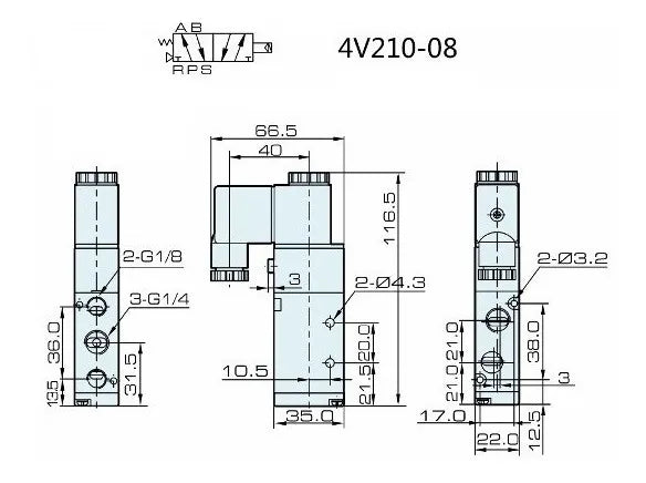 Válvula 5 vias 2 posições. Acionamento por solenóide, retorno por mola.