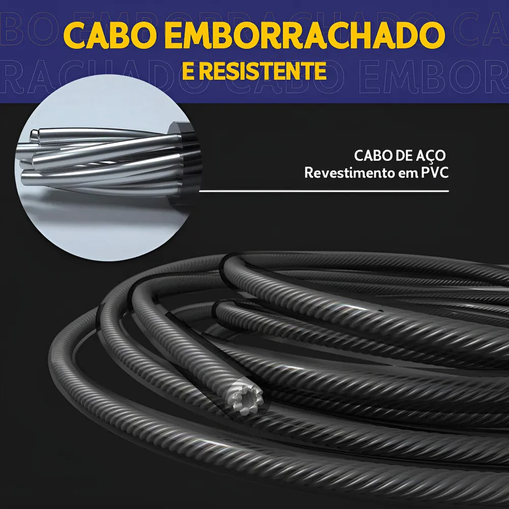• Cabo de aço de alta durabilidade revestido com material em PVC. Embora seja durável, pode ser substituído caso danificado por mau uso.