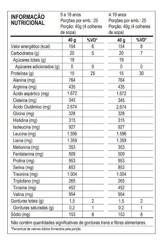 Misture 40g (4 colheres de sopa*) em 200mL (1 copo) da bebida de sua preferência (água mineral, leite desnatado, etc).
